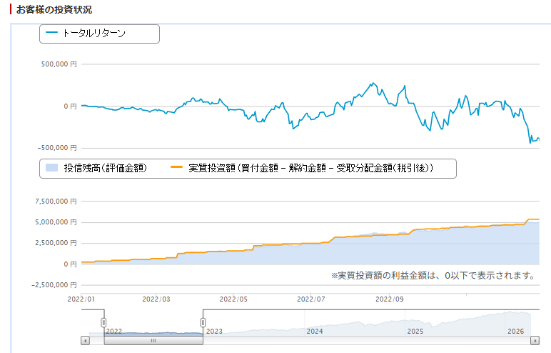 2022年12月までに543万円入金を行い、2022年12月の評価額は496万円と47万円のマイナスです。