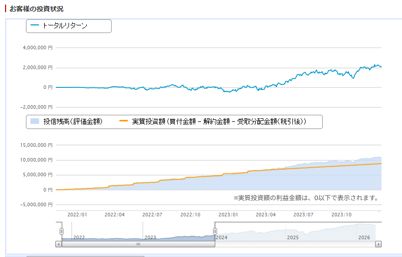 2022年の株価低迷時に積み立てを続けていたこと、そして相場が良かったことから、どんどん利益が増加。